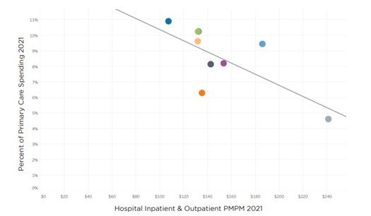 The study also assessed the relationship between spending on primary care and hospital spending for the eight organizations and found that those with higher investment in primary care experienced lower hospital spending as shown below. Though the predictive values were lower than in the quality analysis above, the findings illustrate the potential for primary care to stem avoidable inpatient care and emergency room visits.