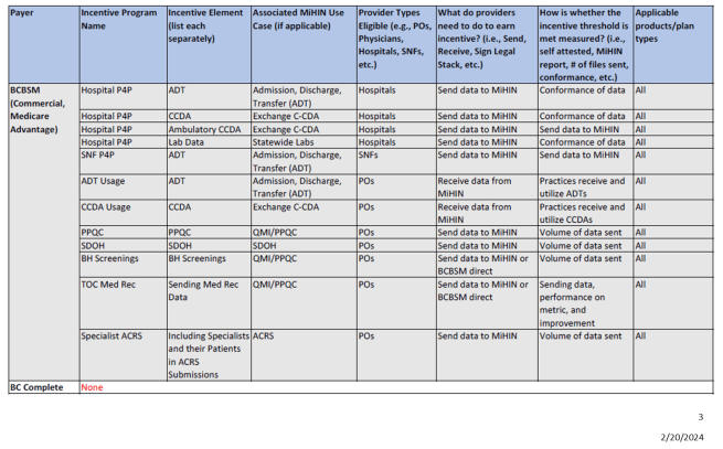 Michigan Multipayer Initiatives (MMI) has collaborated with each payer to create a table of HIE incentives so that providers, POs and systems have a clearer view of incentive programs and requirements. For many organizations, one payer offering an incentive may not warrant their interest, but when several do, it may well create a business case. The table will also contribute to the work of MDHHS’ Health Information Technology (HIT) Commission by creating a multipayer inventory as envisioned in the HIT Roadmap.