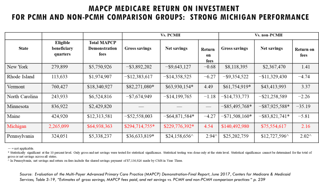 1. Michigan’s MAPCP demonstration yielded an ROI of over 4:1 when compared to PCM practices and over 2:1 when compared to non-PCMH practices in a difference of differences analysis conducted by the Research Triangle Institute. Evaluation of the Multi-Payer Advanced Primary Care Practice (MAPCP) Demonstration
